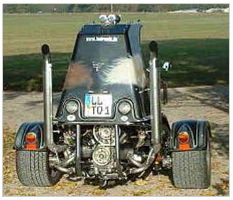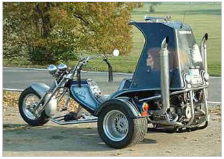 Meine Überlegung mir im Jahr 2001 ein V8-Trike zuzulegen, stieß auf Ablehnung bei Anna-Maria, die das „Kulttrike“ CCS-Kutsche nicht gegen eine Rennsemmel tauschen wollte. Als Kompromiss entschlossen wir uns, das Trike bei CCS umbauen zu lassen. Elektrik wechseln, ein neuer, geschraubter Rahmen, eine Wide-Glide-Gabel mit 200er Schlappen und BBS-Felgen waren fällig. Das klappte auch bis zum Frühjahr 2002. Nur der fremdgekaufte Motor, der den nötigen Schub bringen sollte, wies gravierende Mängel auf, die zu einem Rechtsstreit führten. Dieser wurde im September 2003 zu meinen Gunsten entschieden. Um die Saison nicht „mit ohne“ Trike zu verbringen, kam ein 44 PS Leihmotor ins Heck. |