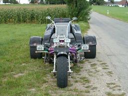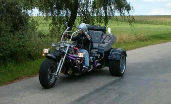 Dank des vorn eingebauten Motors und der daraus resultierenden Vorderradbelastung, ergeben sich erstaunliche Kurvengeschwindigkeiten, ohne das das Vorderrad wegschmiert. Die Hinterachse ist allerdings zu hart gefedert, jeden Stoß fühlt man im verlängerten Rücken. Etwas störend ist das Lenkerflattern in einem bestimmten Geschwindigkeitsbereich. Die Bremse ist im Gegensatz zu meinem Roadliner schon fast abartig. Mit wenig Kraftaufwand kann das Trike brachial verzögert werden. Die Bremskraft wird zu 85 % auf die Hinterräder und zu 15 % auf das Vorderrad verteilt. Gut so, denn die kleine Bremsscheibe vorn hat eigentlich nur eine Stabilisierungsfunktion und neigt so nicht zum Blockieren. |