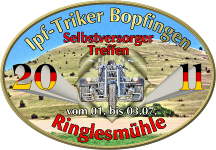 Aus organisatorischen Gründen wurde das Triketreffen der Ipf-Triker von 1.7. bis 3.7.2011 im Selbstversorgermodus veranstaltet. Getränke gab es am Platz und Einkaufsmöglichkeiten in der näheren Umgebung. Für das Mitgebrachte oder Gekaufte stand ein Grill bereit. Damit man sich auf die Selbstversorgung einstellen konnte, wurde diese Thematik rechtzeitig publiziert!