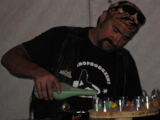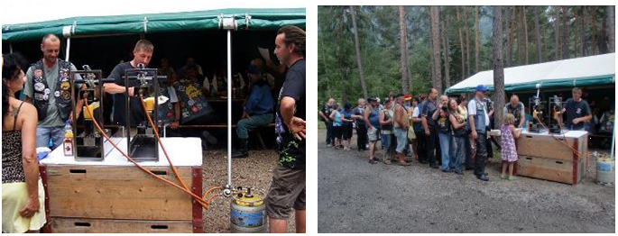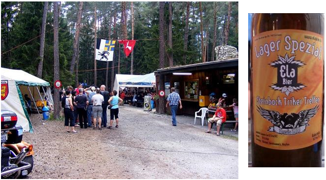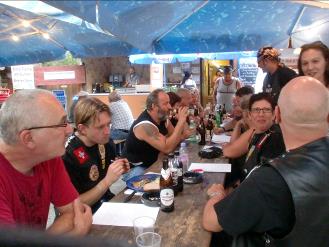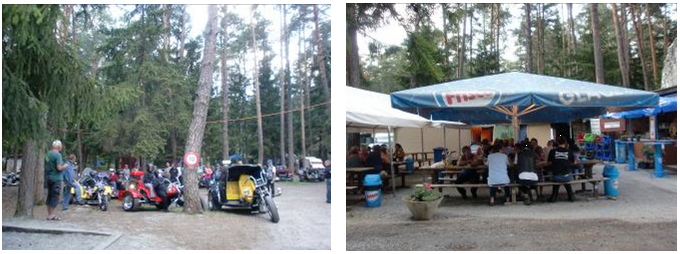 Ca. 70 Trikes standen über die Tage verteilt auf dem Platz, der das Campieren in der Hitze durch die vielen Bäume recht angenehm machte. Einige Triker hatten sich wieder in den umliegenden Hotels oder Pensionen einquartiert. Die Essens- und Getränkeausgabe wurde von der Campingplatz-Crew organisiert, zusätzlich gab es eine Bierbar und am Samstagabend vertrieb der Hochziiter seinen selbst kreierten mintfarbenen Schneckenschleim, der hochprozentig gut runterging. |